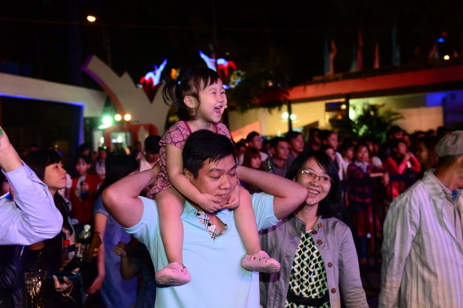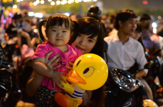 | Gia đình anh Kim Khôi, chị Ngọc Xuân và bé Minh Khuê (2 tuổi) đi chơi tối 31-12 tại trung tâm Q.1, TP.HCM chào đón năm mới |