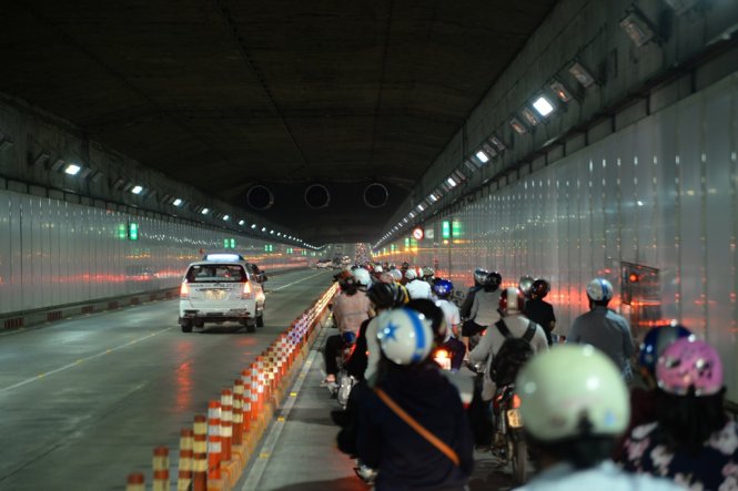 | Lượng xe gắn máy lưu thông qua hầm sông Sài Gòn mỗi dày đặc |