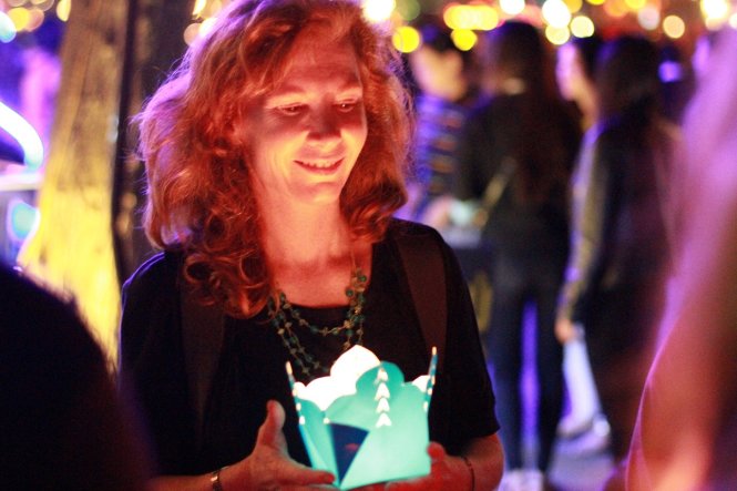 | Một du khách nước ngoài gửi niềm mong ước vào hoa đăng |