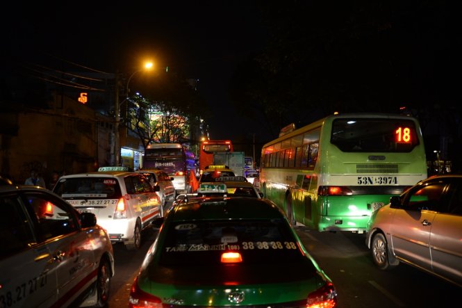 | Xe ô tô và xe buýt bát động trên đường Phạm Ngũ Lão, quận 1 |