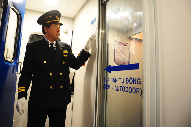 Giữa những toa xe giường nằm có cửa kính bán tự động. Trưởng tàu Đặng Xuân Định đang kiểm tra cửa trước khi đón khách lên tàu.
