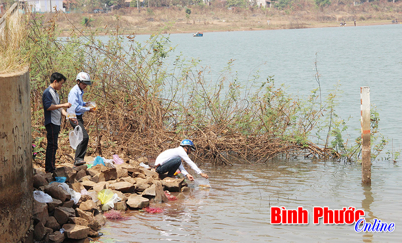 Sau khi hoàn thành các thủ tục cúng ông Táo, bà Nguyễn Thị Xuân ở phường Tân Phú cùng cháu gái đem cá chép ra hồ Suối Cam (TX. Đồng Xoài) phóng sinh với mong muốn cá chép sẽ vượt vũ môn, hóa rồng đưa Táo quân lên diện kiến Ngọc Hoàng