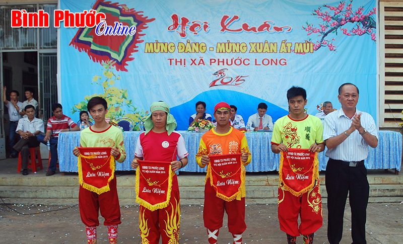 Giải nhất múa lân sư rồng thuộc về thị xã Bình Long, nhì đoàn Chí Thiện Đường, ba Trung tâm văn hóa Lộc Ninh và giải khuyến khích trao cho đoàn Bù Gia Mập (tính từ trái sang)