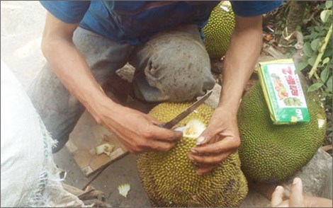 Khoét lỗ trên quả mít để đổ hóa chất