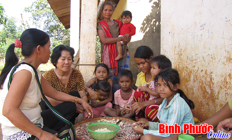 Nhiều em nhỏ ở thôn Phú Thuận, xã Phú Riềng (Bù Gia Mập) cùng phụ giúp ba mẹ bóc vỏ hạt điều trong ngày tết thiếu nhi.