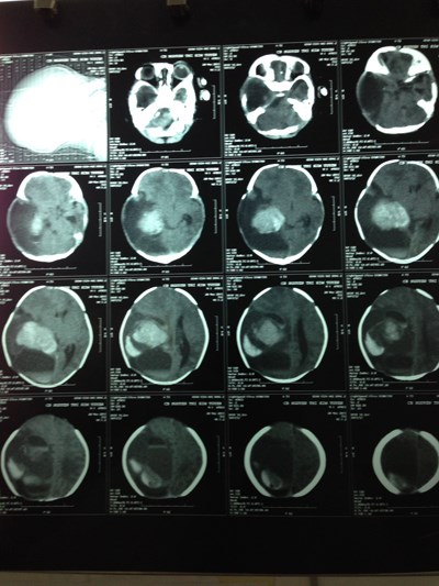 Kết quả chụp CT não bệnh nhi thấy có một khối u não lớn bên phải có biểu hiện chảy máu trong khối u. Một tuần sau bệnh nhi tiếp tục được chụp MRI, các BS nghi ngờ u quái khổng lồ với kích thước 6 x 8 cm, tính luôn phần máu tụ do u não vỡ chảy ra là 10x15 cm.
