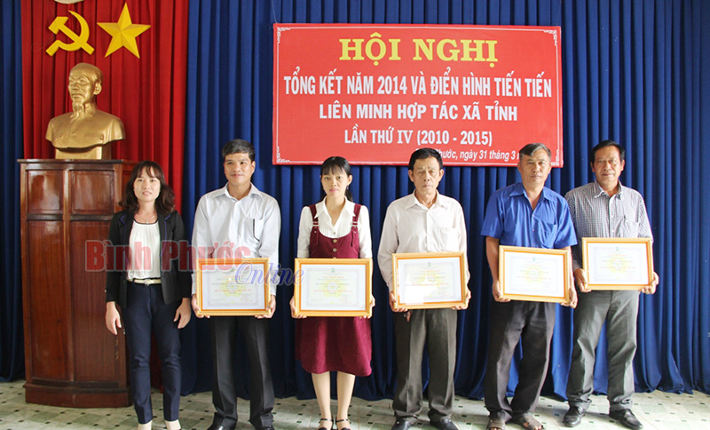 Bà Nguyễn Thị Thanh Phương, Phó giám đốc Liên minh HTX tỉnh trao giấy khen cho các HTX điển hình tiên tiến năm 2014