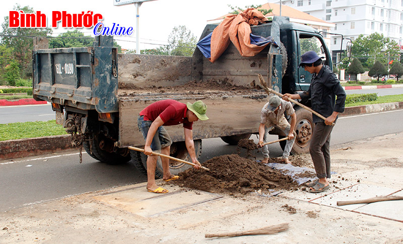 Cuối giờ làm, công nhân xúc bùn sình lên xe, chở đi đổ, trả lại đường phố sạch sẽ, tinh tươm.