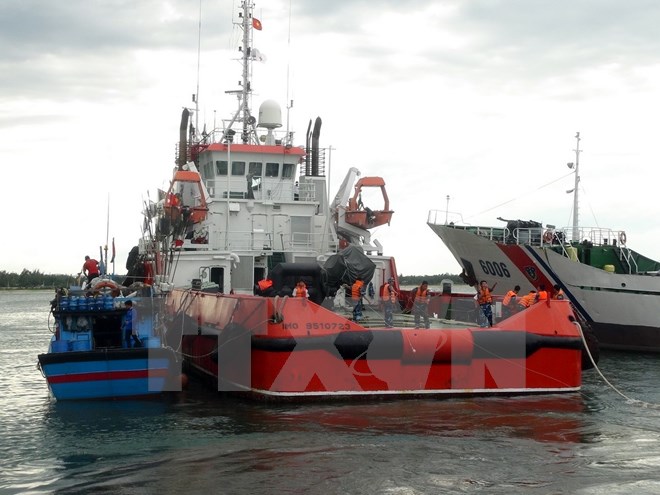 Tàu cảnh sát biển lai dắt một tàu cá gặp nạn vào bờ. Ảnh minh họa