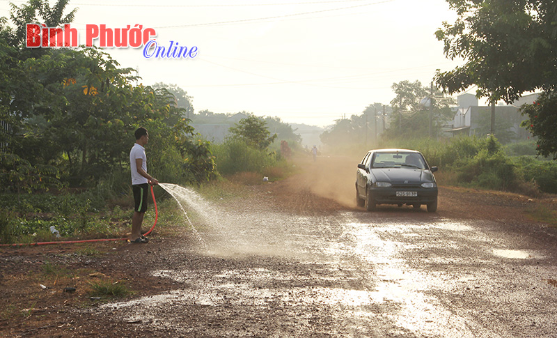 Nhiều tuyến đường trong ấp mỗi ngày người dân phải xịt nước nhằm giảm hậu quả của “sống chung với bụi”