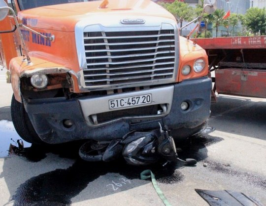 Một xe máy kẹt cứng dưới đầu xe container