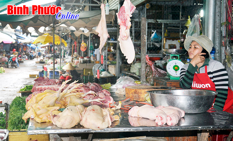 Các quầy bán thịt gia súc, gia cầm ở chợ Đồng Xoài được kiểm soát chặt chẽ về vệ sinh an toàn thực phẩm - Ảnh: S.H