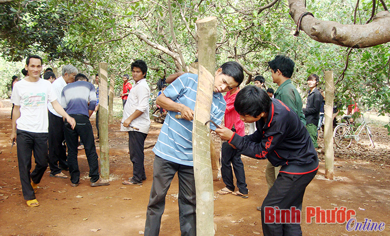 Thanh niên DTTS thôn Khắc Khoan, xã Phú Nghĩa (Bù Gia Mập) học nghề cạo mủ cao su mong kiếm được việc làm sau khóa học - Ảnh: H.C