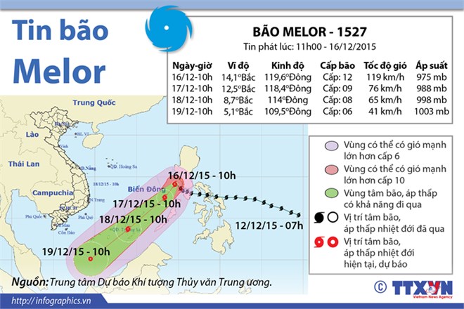 Lúc 14 giờ ngày 16-12, vị trí tâm bão số 5 cách đảo Song Tử Tây (thuộc quần đảo Trường Sa) khoảng 680km về phía Đông Bắc. Sức gió mạnh nhất ở vùng gần tâm bão mạnh cấp 10 (tức là từ 90 đến 100km một giờ), giật cấp 11-12.