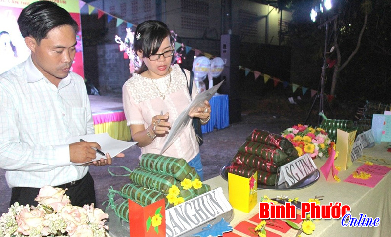 Ban giám khảo chấm điểm các đội thi gói bánh chưng và làm thiệp chúc tết