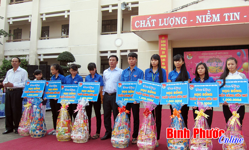 Trong chương trình, ông Đỗ Hoàng Nhi, Bí thư chi bộ Phòng Sản xuất chương trình, Đài Phát thanh - Truyền hình Bình Phước trao học bổng năm học 2015-2016 trị giá 4,8 triệu đồng do đảng viên trong chi bộ đóng góp, ủng hộ em Nguyễn Văn Thuận, lớp 12C; cô Đặng Thị Nghìn, giáo viên của trường trao học bổng trị giá 5 triệu đồng của Công ty TNHH MTV du lịch Thụy Khuê cho em Đặng Ngọc Quỳnh My, học sinh lớp 12D2; Thị đoàn Đồng Xoài trao 9 suất học bổng thuộc công trình thanh niên “Cùng bạn vượt khó”, mỗi suất trị giá 1,8 triệu đồng cho 9 học sinh có hoàn cảnh khó khăn vượt khó học giỏi; một phụ huynh cũng đã trao 5 suất học bổng, mỗi suất 1 triệu đồng cho 5 học sinh của trường.