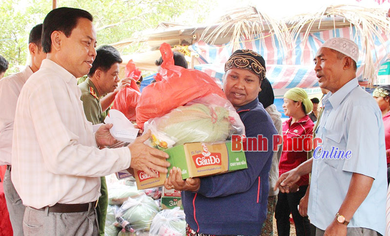 Lãnh đạo Huyện ủy, UBND, Công an huyện Đồng Phú tặng nhiều phần quà nhằm giúp đồng bào Chăm vui xuân đón tết
