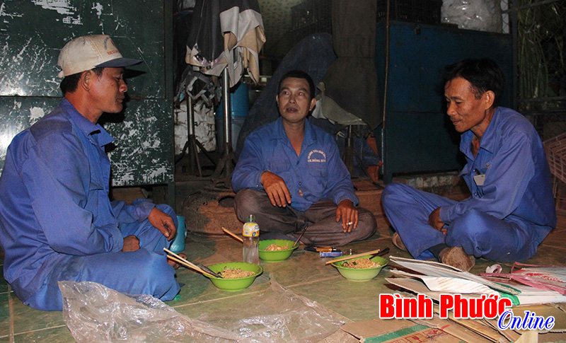 Phút nghỉ ngơi hiếm hoi của công nhân phụ trách khu vực chợ Đồng Xoài trong lúc chờ xe vận chuyển rác đến. Hiện xí nghiệp mới chỉ được đầu tư 3 xe chuyên dụng chở rác, nên những ngày tết luôn quá tải khiến anh, chị em phải ngồi chờ trong đêm giá rét.
