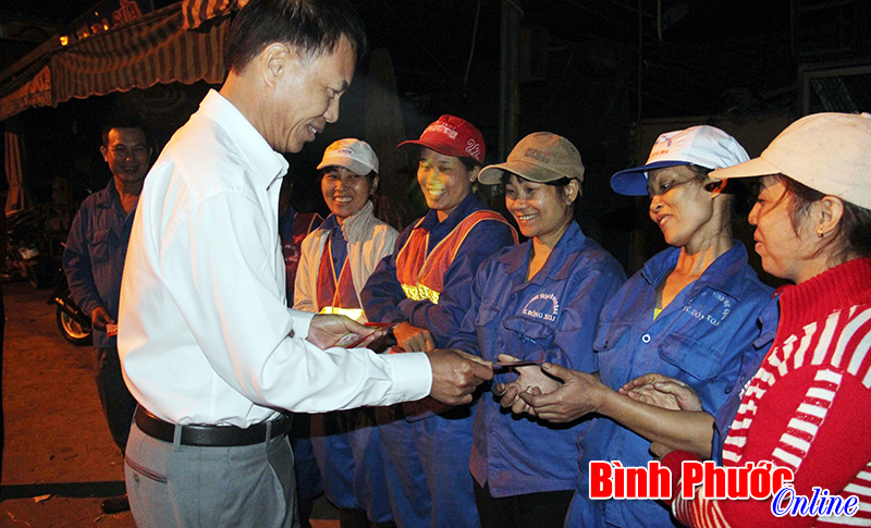 Dù công việc cực nhọc nhưng khi được lãnh đạo thị xã Đồng Xoài lì xì lộc đầu năm, ai cũng cười vui, hạnh phúc