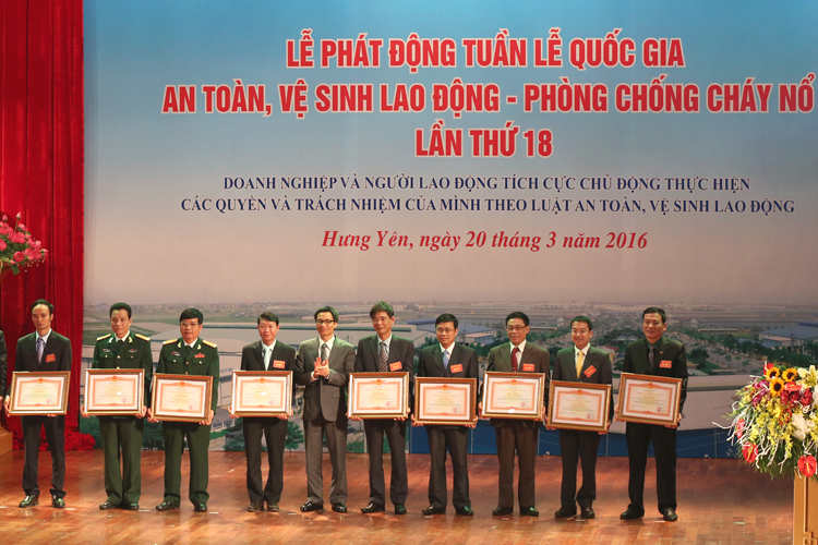 * Nhân dịp này, thay mặt lãnh đạo Chính phủ, Phó Thủ tướng Vũ Đức Đam trao Bằng khen Thủ tướng Chính phủ cho những DN, cá nhân có thành tích xuất sắc trong công tác an toàn, vệ sinh lao động và phòng chống cháy nổ.