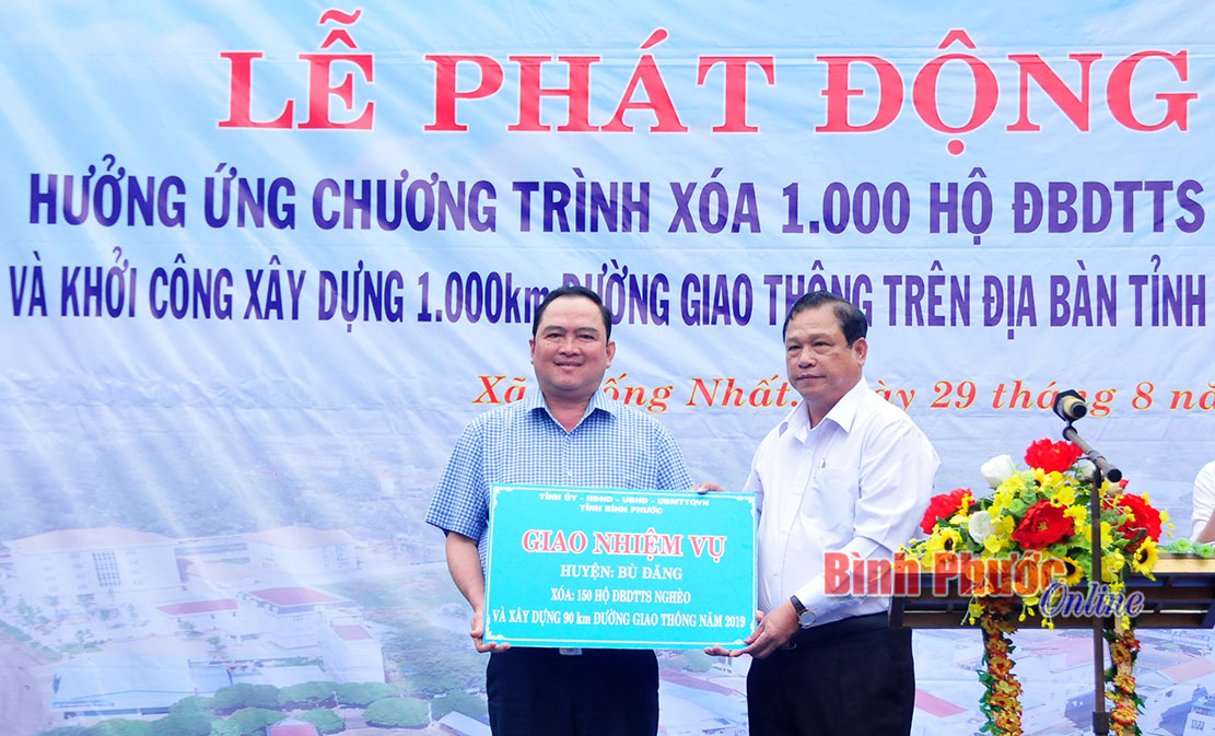 2 huyện Bù Đốp và Bù Đăng được chọn làm điểm phát động chương trình xây dựng 1.000km đường bê tông xi măng và xóa 1.000 hộ nghèo DTTS. Trong đó, huyện Bù Đốp được giao xây dựng 70km đường và xóa 97 hộ DTTS nghèo. Đến nay, huyện đã hoàn thành trên 25km đường bê tông xi măng và dự kiến đến tháng 11 sẽ hoàn thành chỉ tiêu tỉnh phân bổ. Đối với công tác giảm nghèo, huyện đã khảo sát, phấn đấu hoàn thành chỉ tiêu giảm 100 hộ DTTS nghèo. Huyện Bù Đăng được giao chỉ tiêu giúp 150 hộ thoát nghèo và xây dựng 90km đường giao thông nông thôn. Nguồn kinh phí dự trù hỗ trợ 150 hộ thoát nghèo hơn 8,4 tỷ đồng. Đến nay, huyện đã phê duyệt 64,2km đường giao thông nông thôn với tổng vốn đầu tư hơn 50,57 tỷ đồng và đã thực hiện được 40,6km. Còn lại 25,8km đang hoàn thành hồ sơ, thủ tục để phê duyệt và triển khai thực hiện.