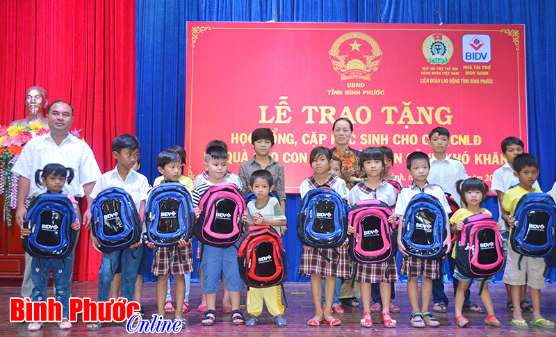 Theo đó, LĐLĐ tỉnh đã trao tặng 170 phần quà của UBND tỉnh cho 170 công nhân có hoàn cảnh khó khăn, mỗi phần trị giá 300 ngàn đồng; trao tặng 140 phần quà của Quỹ bảo trợ trẻ em Công đoàn Việt Nam, vận động Ngân hàng TMCP đầu tư và phát triển Việt Nam (BIDV) cho 140 em học sinh là con em công nhân, lao động có hoàn cảnh khó khăn, mỗi phần quà gồm 1 cặp học sinh và tập viết, trị giá 200 ngàn đồng. LĐLĐ tỉnh còn trao 6 suất học bổng cho 6 em học sinh giỏi vượt khó là con em công nhân, lao động, mỗi suất trị giá 500 ngàn đồng.