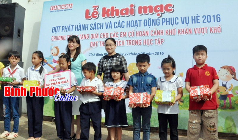 Dịp này, nhà sách Fahasa Bình Phước đã tặng 60 phần quà cho học sinh có hoàn cảnh khó khăn, vượt khó, đạt thành tích tốt trong học tập. Trong đó, phần quà đặc biệt gồm cặp, sách khoa giáo, truyện, dụng cụ học tập trị giá 370 ngàn đồng/phần tặng 10 học sinh khó khăn nhất. Các phần quà gồm vở, viết, dụng cụ học tập tặng 50 học sinh còn lại.