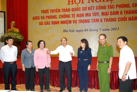 Phó Thủ tướng Nguyễn Xuân Phúc trao đổi cùng các đại biểu tại Hội nghị trực tuyến toàn quốc sơ kết 6 tháng công tác phòng, chống AIDS và phòng, chống tệ nạn ma tuý, mại dâm, ngày 8-7 |