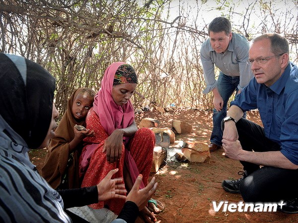 Ông Andrew Witty, Giám đốc điều hành của GSK (ngồi) và ông Justin Forsyth, Giám đốc điều hành Save the Children thăm hỏi gia đình các trẻ em khó khăn