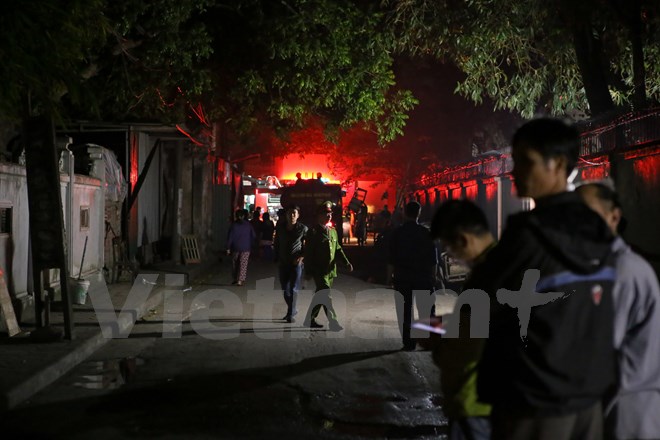 Khoảng 15 phút sau khi nhận được tin báo, lực lượng chức năng đã có mặt kịp thời để phong toả và khống chế đám cháy. (Ảnh: Minh Sơn/Vietnam+)