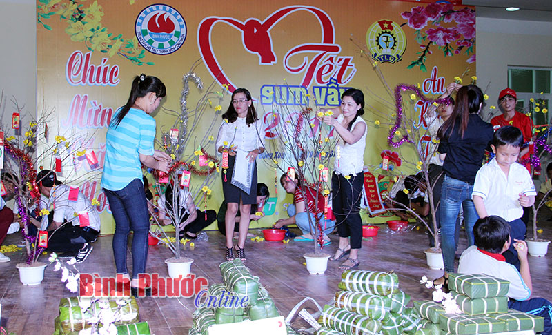 Thanh niên, công nhân KCN Đồng Xoài I và II thi cắm mai vàngTối ngày 19-1, mặc dù còn gần 10 ngày nữa mới đến Tết nguyên đán, nhưng hàng ngàn thanh niên, công nhân KCN Đồng Xoài I, II và người dân trên địa bàn xã Tiến Thành và Tân Thành, thị xã Đồng Xoài đã tập trung tại khuôn viên Trung tâm hỗ trợ thanh niên công nhân tỉnh để tham gia chương trình “Tết sum vầy 2017”. Để tạo không khí tết, tại chương trình, Ban tổ chức đã tổ chức thi gói bánh chưng, bánh tét. Các đội tham gia thi gói bánh đều được Ban tổ chức hỗ trợ 500 ngàn đồng để mua nguyên liệu làm bánh như: gạo nếp, nhân đậu xanh, thịt heo, lá dong…