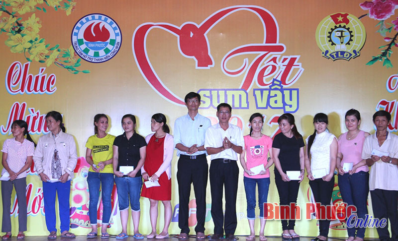 Cùng với các hoạt động vui chơi, Ban tổ chức còn quan tâm hỗ trợ quà tết cho thanh niên, công nhân có hoàn cảnh khó khăn, không có điều kiện về quê ăn tết cùng gia đình. Hiện trên địa bàn tỉnh có khoảng 40 ngàn công nhân lao động đến từ khắp các tỉnh, thành trong cả nước hiện đang làm việc trong các công ty, doanh nghiệp trên địa bàn tỉnh. Hàng năm có khoảng 60% công nhân ở lại làm việc trong dịp Tết nguyên đán, trong đó không ít công nhân có hoàn cảnh đặc biệt khó khăn, không có điều kiện về quê ăn tết cùng gia đình. Hằng năm, trung tâm đều phối hợp với các đơn vị liên quan tổ chức vận động các doanh nghiệp, mạnh thường quân tặng quà cho công nhân. Tại chương trình “Tết sum vầy”, Ban tổ chức đã trao 268 phần quà, mỗi phần trị giá 300 ngàn đồng cho công nhân xa quê tại KCN Đồng Xoài I và II.