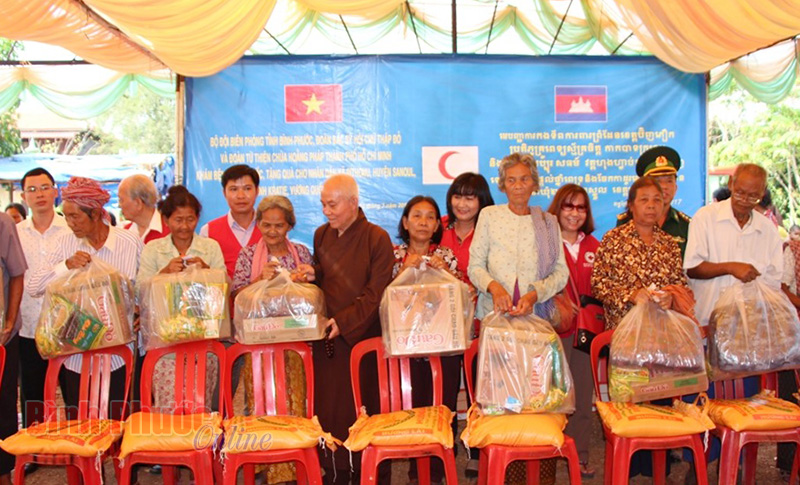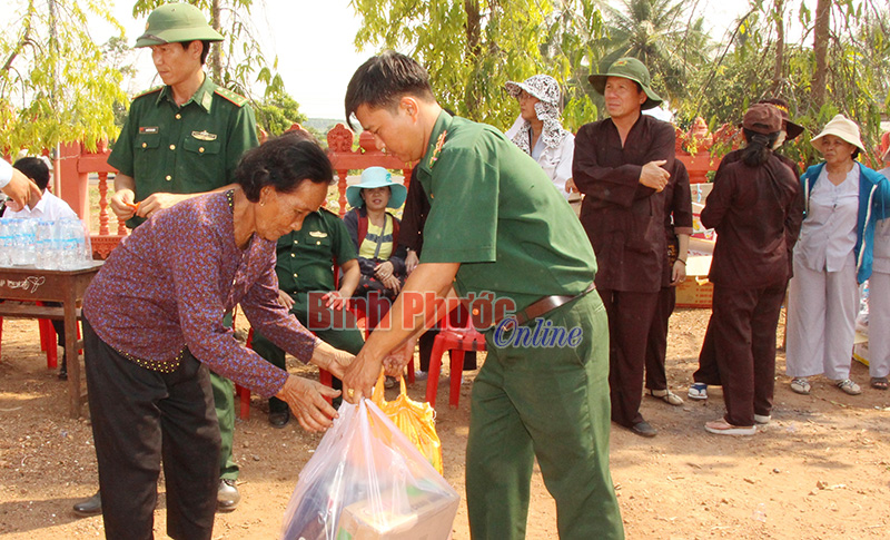 | Ngoài khám và phát thuốc miễn phí, đoàn từ thiện còn tặng 300 phần quà gồm: gạo, mì tôm, bánh kẹo, quần áo, mền… trị giá 300 ngàn đồng/phần cho 300 hộ dân hoàn cảnh khó khăn của xã Pithanu. Đây là hoạt động mang ý nghĩa thiết thực nhằm động viên, chia sẻ phần nào khó khăn của người dân. Đồng thời tăng cường tình đoàn kết, hữu nghị giữa Bộ đội biên phòng tỉnh Bình Phước với chính quyền, nhân dân, lực lượng vũ trang huyện Sanual, tỉnh Karatie (Vương quốc Campuchia). Từ đây, góp phần giữ vững biên giới, hòa bình, hữu nghị, hợp tác và phát triển” - Thượng tá Hoàng Văn Thành, Phó chính ủy Bộ chỉ huy Bộ đội biên phòng tỉnh Bình Phước cho biết. |