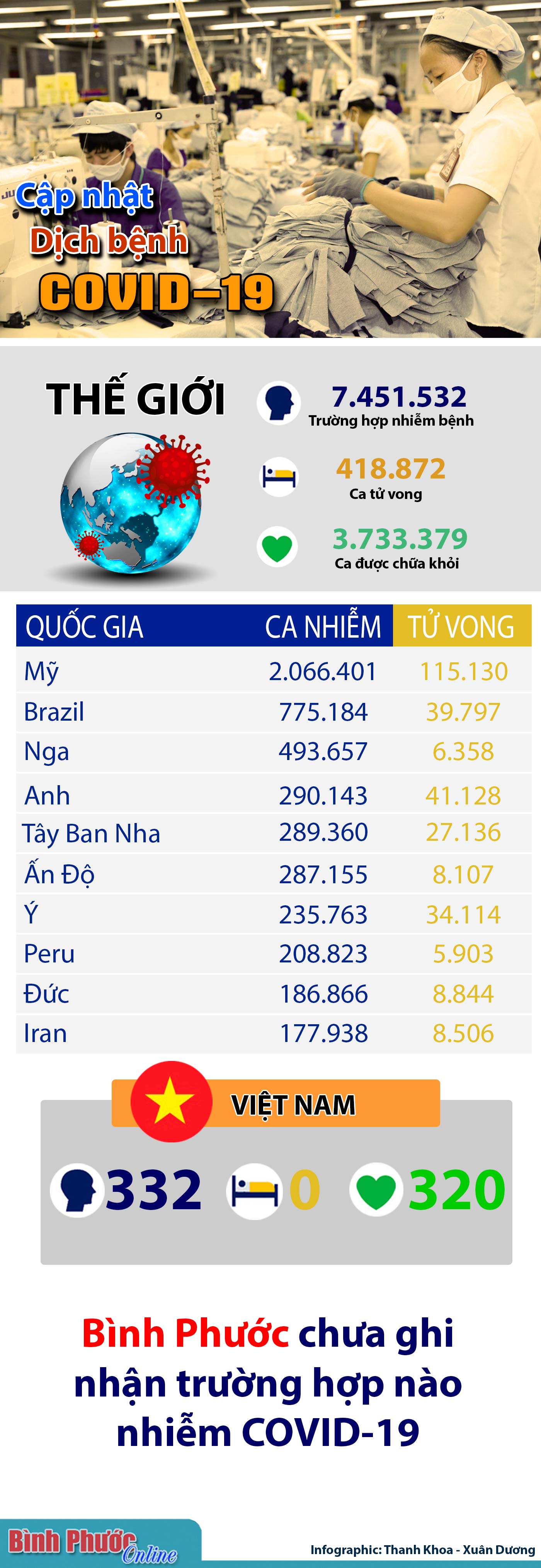 Theo thống kê từ wordometers.info, tính đến 8h sáng 11-6, toàn thế giới ghi nhận 7.446.229 người mắc bệnh viêm đường hô hấp cấp COVID-19, trong đó có 418.137 người đã tử vong.