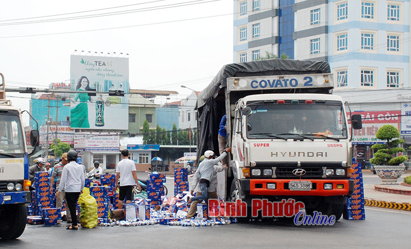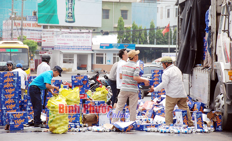 Người dân chứng kiến vụ việc cho biết: Khoảng 12 giờ trưa 28-3, xe tải biển số 54S-3088 lưu thông hướng từ Bình Dương đi Phước Long. Đến ngã tư Đồng Xoài (vòng xuyến giao lộ giữa QL14 và ĐT741) khi ôm cua bất ngờ thùng xe bên hông phải bị bật chốt, bung cửa khiến hàng trăm thùng bia Tiger (bia lon) rơi xuống mặt đường. Một lượng lớn bia bị bể tràn lan khắp mặt đường giữa buổi trưa nắng, mùi bia nồng nặc.