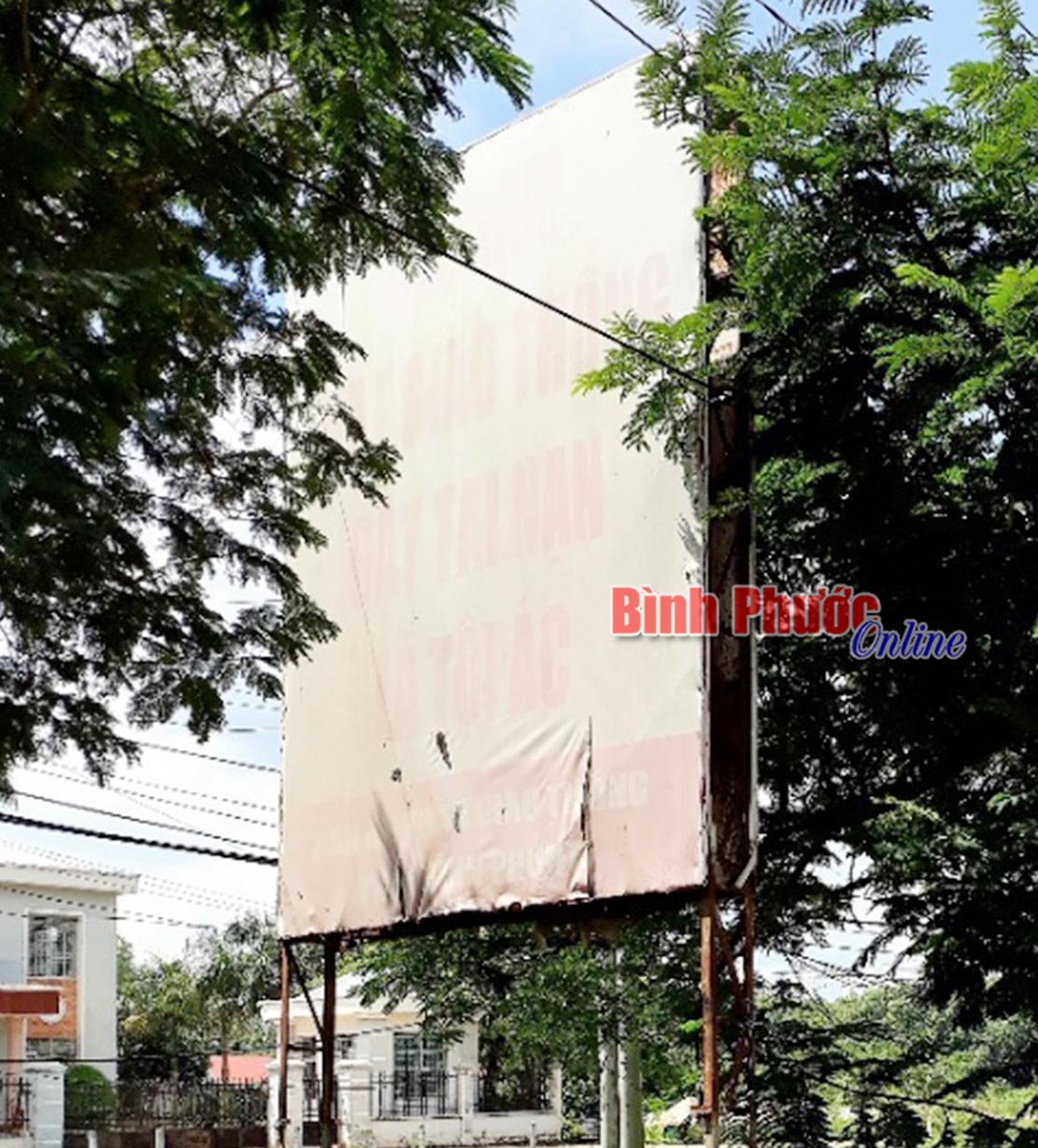 BP - Trên quốc lộ 13, đoạn trước trụ sở UBND phường Phú Đức, thị xã Bình Long tồn tại một pa-nô tuyên truyền về an toàn giao thông nhưng bạt cũ, rách, khó đọc chữ và bị tán cây che khuất nên không còn tác dụng (ảnh). Đề nghị UBND phường Phú Đức, Ban An toàn giao thông tỉnh sớm thay mới, phát quang để pa-nô phát huy tác dụng, đẹp cảnh quan thị xã.