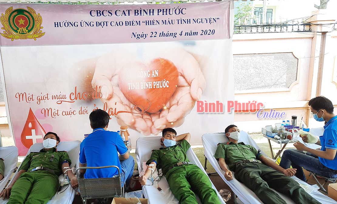 Từ ngày 21 đến 24-4, Công an tỉnh phối hợp với các đơn vị liên quan tổ chức 6 đợt tiếp nhận máu tại Trung tâm Huấn luyện và Bồi dưỡng nghiệp vụ Công an tỉnh, Bệnh xá Công an tỉnh, công an các huyện Lộc Ninh, Hớn Quản, Bù Đăng và thị xã Phước Long.