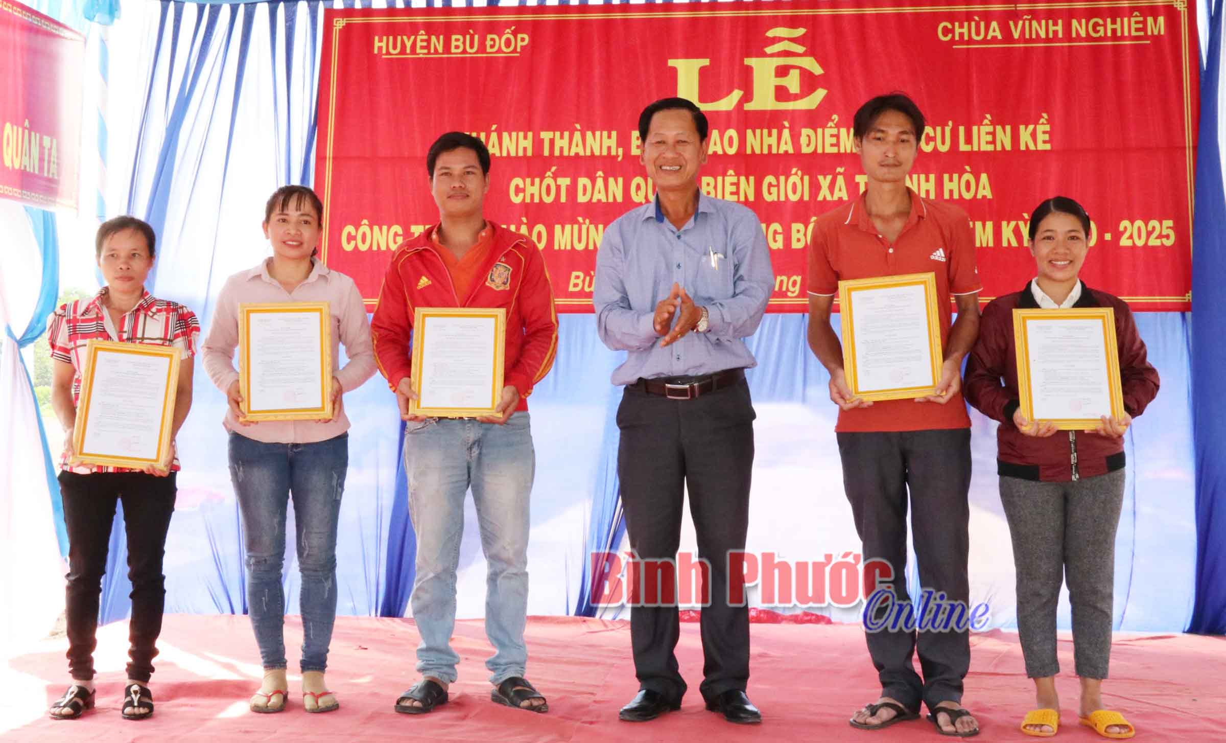 Phó chỉ huy trưởng, Ban Chỉ huy quân sự tỉnh Nguyễn Thành Ruân và Tỉnh ủy viên, Bí thư Huyện ủy Giang Thị Phương Hạnh trao quyết định cho các hộ dân thụ hưởngSau hơn 1 tháng khởi công xây dựng, 10 căn nhà tại Điểm dân cư biên giới Thanh Hòa, huyện Bù Đốp được khánh thành, bàn giao đưa vào sử dụng. Trong đó có 5 căn do Chùa Vĩnh Nghiêm, thành phố Hồ Chí Minh hỗ trợ 180 triệu đồng/căn. Nhà được xây theo thiết kế cấp 4, mỗi căn có diện tích 80m2, gồm: 1 phòng khách, 2 phòng ngủ, phòng bếp, nhà vệ sinh tự hoại, hệ thống điện, nước đầy đủ.