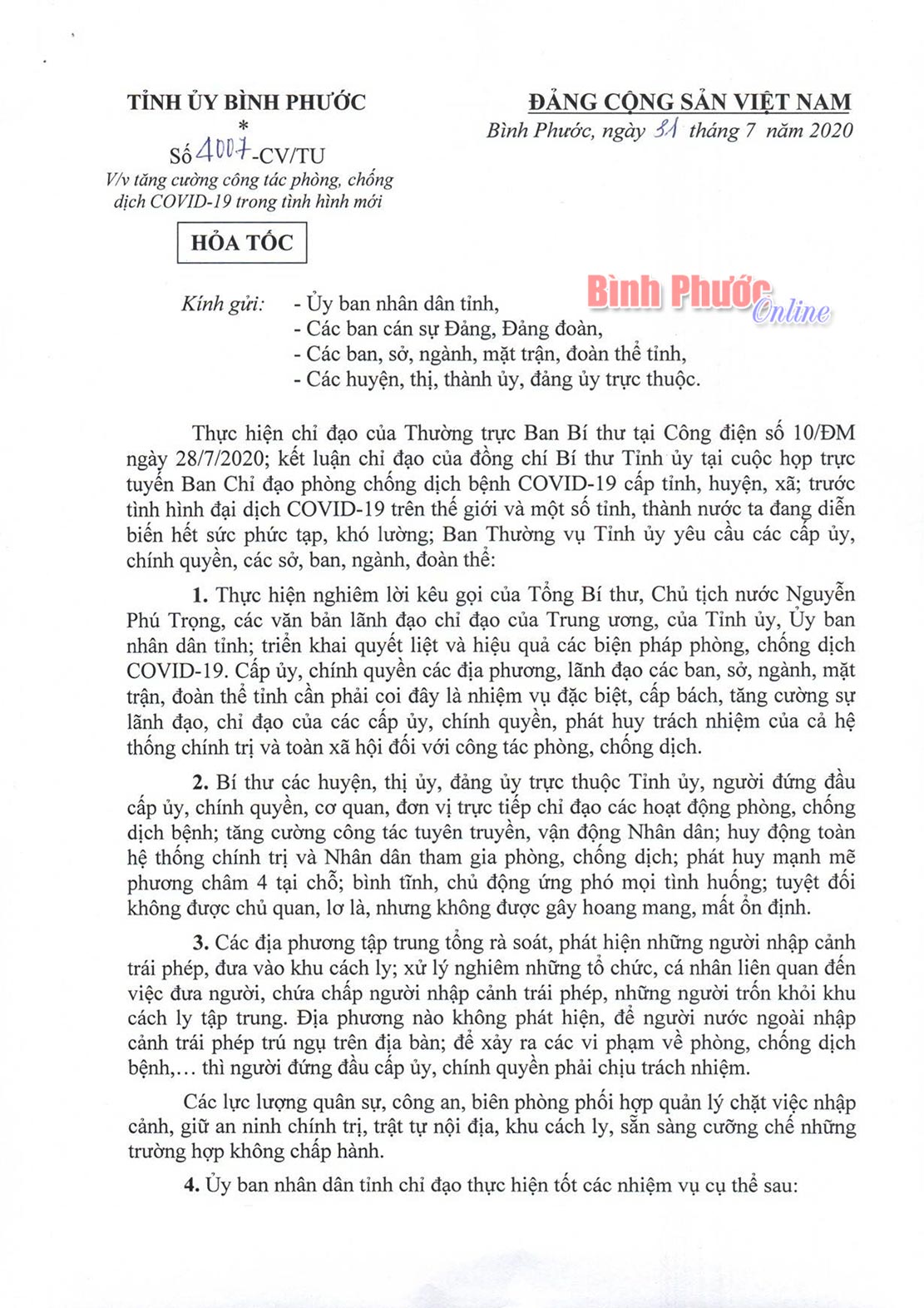 Triển khai chỉ đạo của Thường trực Ban Bí thư Trung ương Đảng về “Tăng cường công tác phòng, chống dịch bệnh Covid-19 trong tình hình mới", Thường trực Tỉnh ủy Bình Phước yêu cầu các cấp, các ngành tiếp tục quán triệt và triển khai quyết liệt và hiệu quả các biện pháp phòng, chống dịch Covid-19. Cấp ủy, chính quyền các địa phương, lãnh đạo các ban, sở, ngành, mặt trận, đoàn thể tỉnh cần phải coi đây là trách nhiệm đặc biệt, cấp bách. Đồng thời, tăng cường sự lãnh đạo, chỉ đạo các cấp ủy, chính quyền, phát huy trách nhiệm của cả hệ thống chính trị và toàn xã hội đối với công tác phòng, chống dịch.