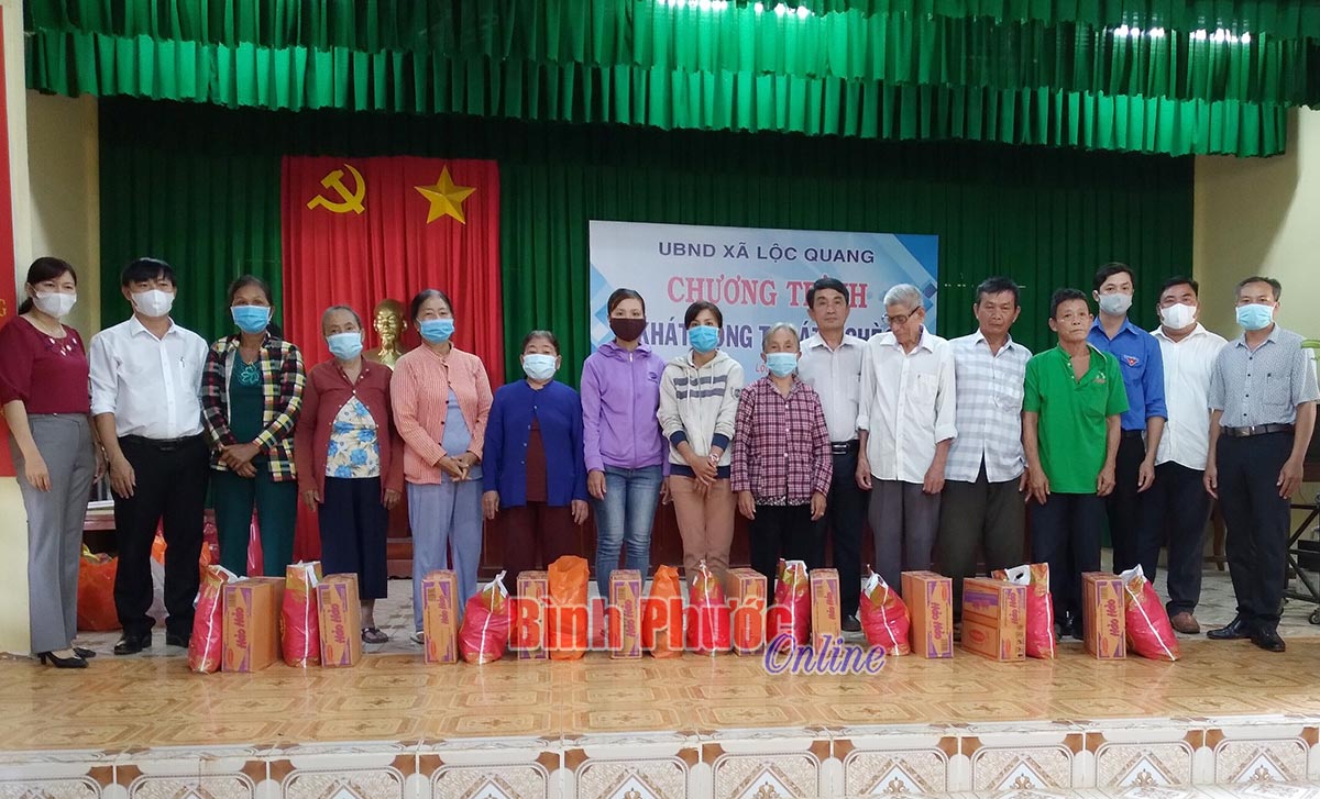 Lãnh đạo huyện, xã trao quà cho các hộ nghèo trên địa bàn xã Ngoài ra, Lộc Quang đã khảo sát cụ thể về nhu cầu xã hội cơ bản còn thiếu hụt của từng hộ nghèo, qua đó chủ động đề xuất huyện hỗ trợ trong chương trình hỗ trợ 1.000 hộ nghèo DTTS thoát nghèo trong năm 2020 của tỉnh theo chỉ tiêu giao. Số còn lại UBND xã phối hợp với Ủy ban MTTQ , các đoàn thể và chi bộ các ấp bàn bạc, thống nhất giải pháp hỗ trợ phù hợp.
