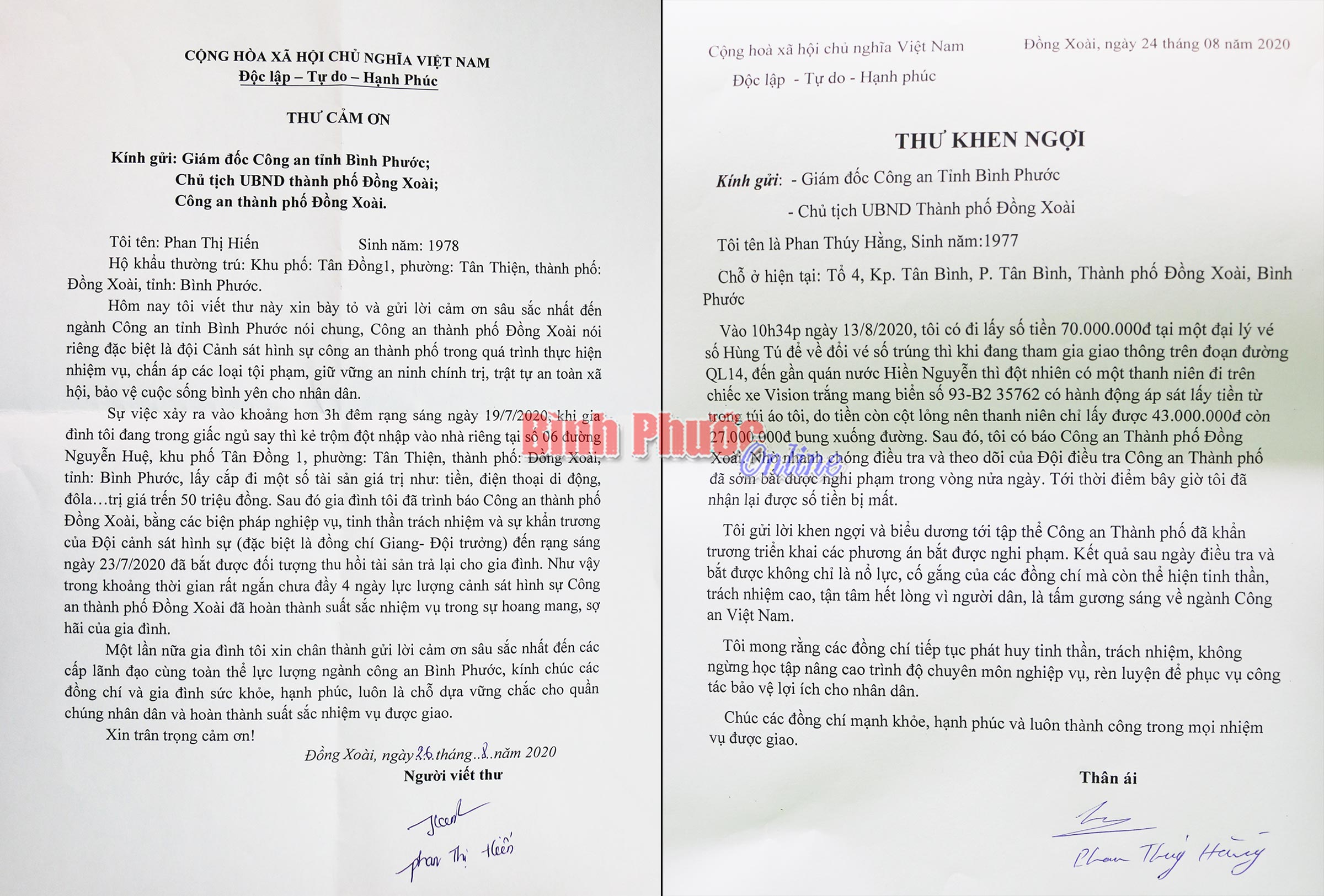Hai lá thư của người dân gửi khen ngợi và cảm ơn Công an thành phố Đồng XoàiTrước đó ngày 26-8, chị Phan Thị Hiến, 42 tuổi, trú khu phố Tân Đồng 1, phường Tân Thiện cũng đã gửi thư cảm ơn sâu sắc đến Công an thành phố Đồng Xoài. Đặc biệt là Trung tá Nguyễn Trường Giang, Đội trưởng đội cảnh sát hình sự vì đã nhanh chóng điều tra làm rõ và bắt giữ thủ phạm gây ra vụ trộm cắp tài sản trị giá trên 50 triệu đồng tại gia đình chị vào rạng sáng ngày 19-7-2020.