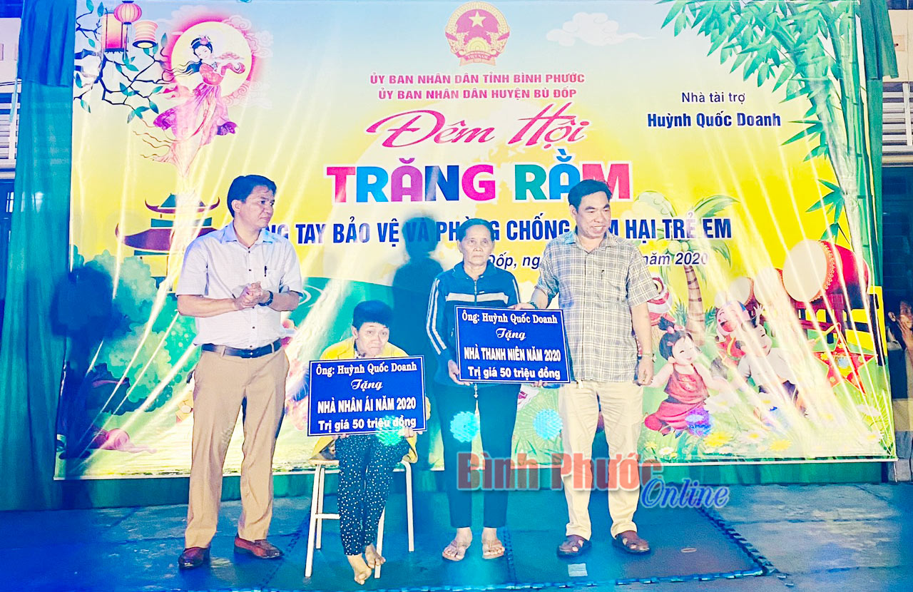 Phó bí Thư thường trực Huyện ủy Bù Đốp Mai Xuân Tuân cùng nhà tài trợ trao 2 nhà nhân ái có tổng trị giá 100 triệu cho 2 hộ dânBan tổ chức đã trao 20 chiếc xe đạp cho học sinh nghèo hiếu học, 2 nhà nhân ái cho hộ nghèo khó khăn về nhà ở và 400 phần quà trung thu với tổng trị giá 150 triệu đồng.