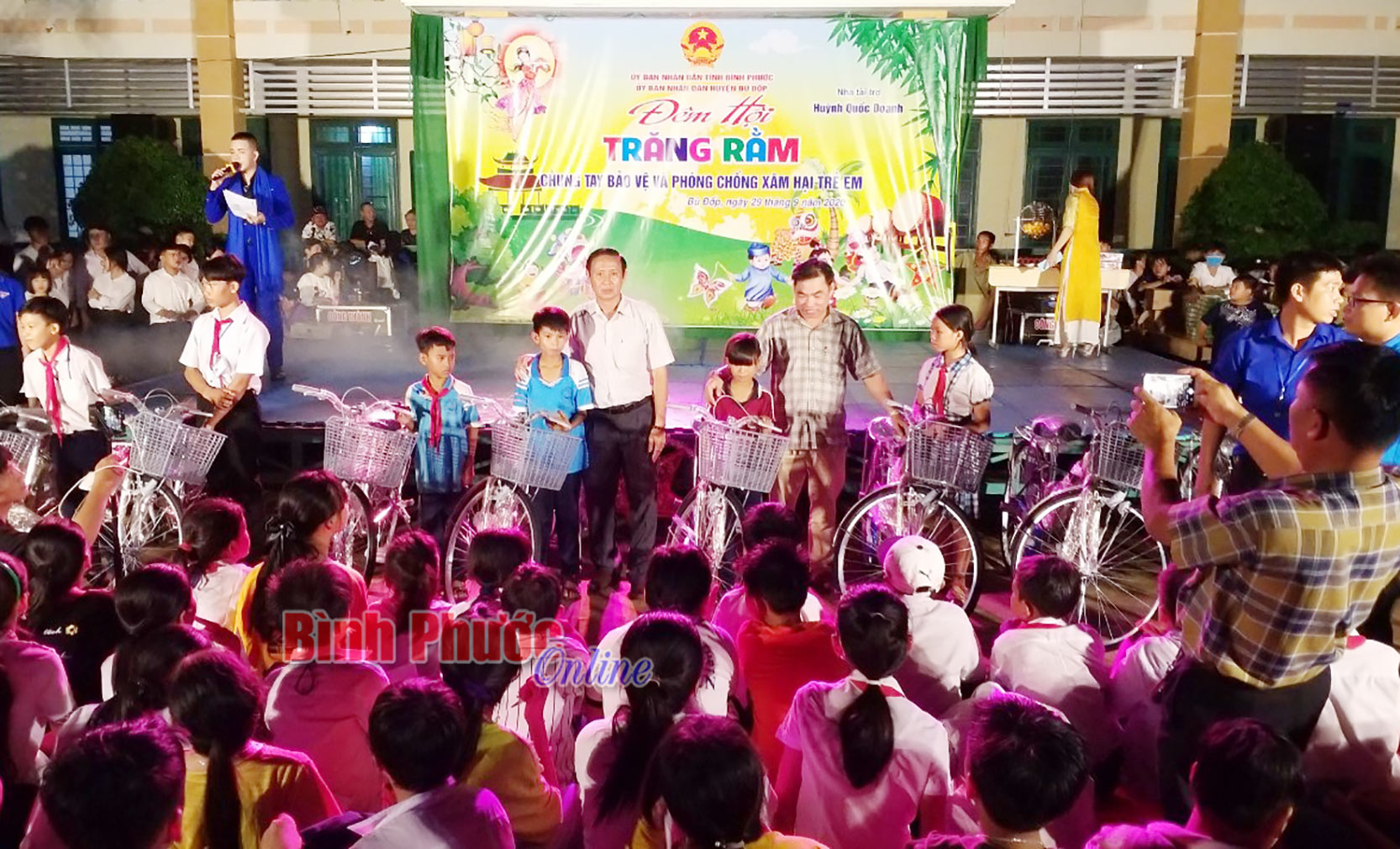 Phó chủ tịch Thường trực HĐND huyện Nguyễn Hoành Sơn cùng nhà tài trợ trao 10 xe đạp trị giá 40 triệu đồng cho học sinh vượt khó học giỏiChương trình “Đêm hội trăm rằm” là một sân chơi lành mạnh, bổ ích, an toàn và ý nghĩa trong dịp tết Trung thu. Hoạt động còn là món quà tinh thần cho các em thiêu nhi vùng khó khăn biên giới Bù Đốp. Đồng thời tạo môi trường xã hội lành mạnh giáo dục thanh thiếu nhi, nâng cao vai trò, trách nhiệm của cả xã hội.