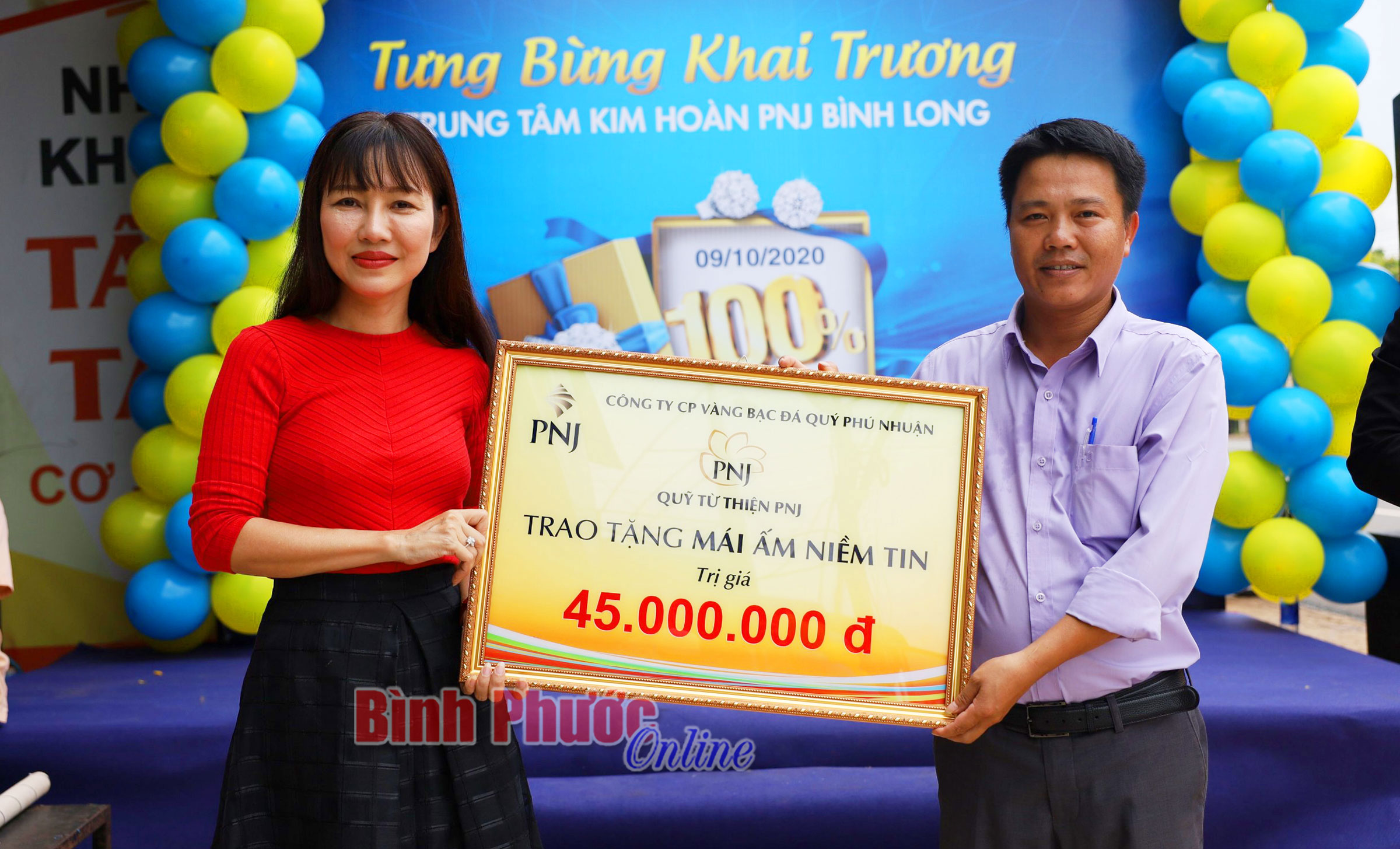 Trong ngày khai trương, quỹ từ thiện PNJ đã trao bảng tặng 1 Mái ấm niềm tin trị giá 45 triệu đồng cho hội viên phụ nữ nghèo xã Thanh Phú, thị xã Bình Long. Qua đó khẳng định doanh nghiệp luôn đồng hành chia sẻ hoàn cảnh khó khăn vì cộng đồng trên địa bàn doanh nghiệp đứng chân.