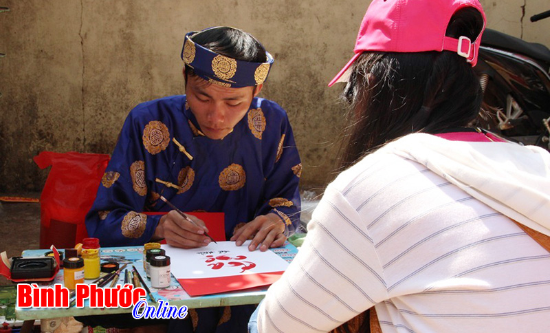 Ông đồ Nguyễn Đức Tiến cho chữ tại chùa Thanh Trí, xã Bù Nho, huyện Phú Riềng - một nét đẹp trong những ngày xuân