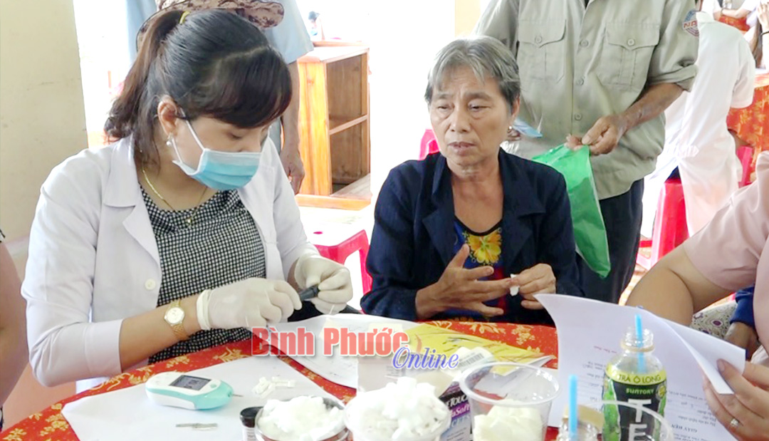 Người bệnh được lấy mẫu máu test đái tháo đườngQua khám kiểm tra, người bệnh được kê toa và nhận thuốc uống điều trị miễn phí, chủ động theo dõi bệnh tật.