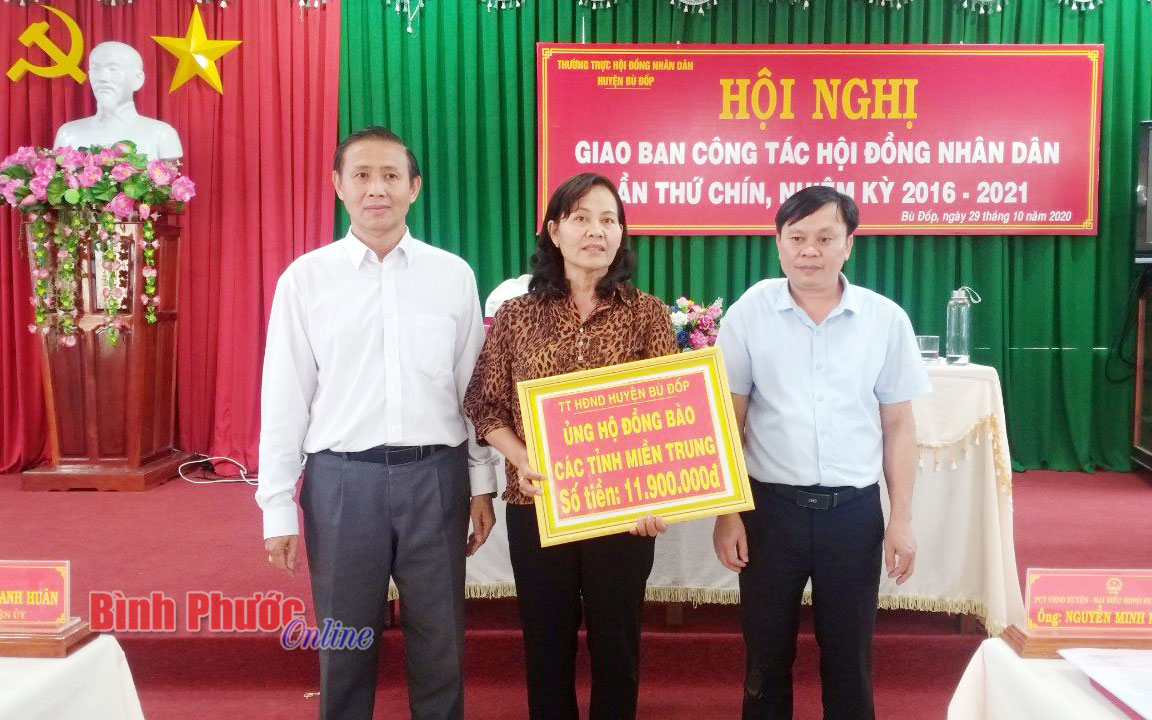 Tính đến chiều nay 30-10, Ủy ban MTTQ Việt Nam huyện Bù Đốp tiếp nhận số tiền ủng hộ đồng bào miền Trung bị thiệt hại do lũ 803 triệu đồng.