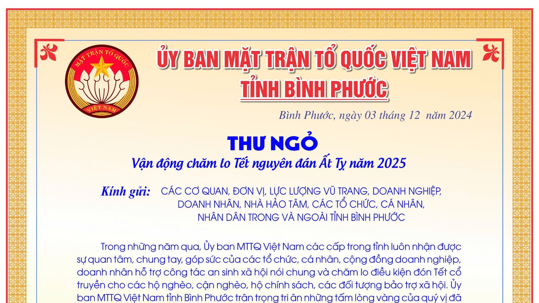 BPO - Ngày 3-12, Ủy ban MTTQ Việt Nam tỉnh Bình Phước ban hành thư ngỏ vận động chăm lo tết Nguyên đán Ất Tỵ - năm 2025 gửi các cơ quan, đơn vị,...