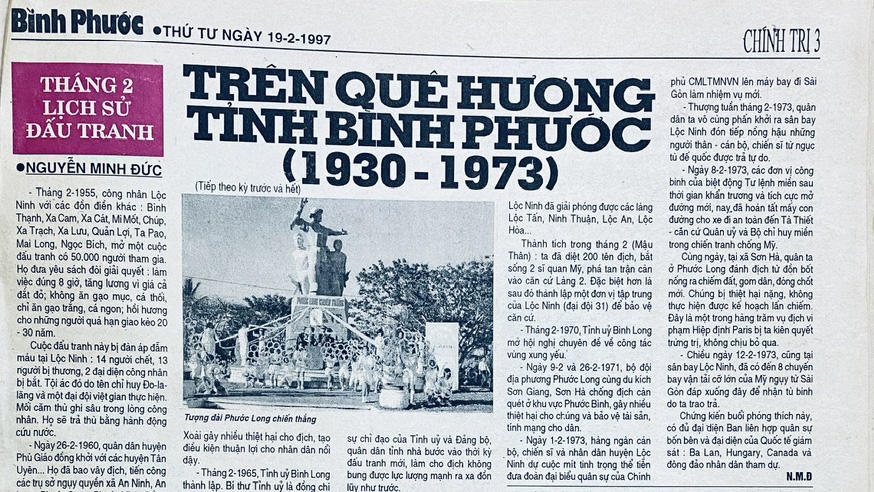 BPO - Quê hương Bình Phước có nhiều sự kiện lịch sử vô cùng ý nghĩa. Tháng 2 lịch sử đấu tranh trên quê hương tỉnh Bình Phước (1930-1973) là sự kiện đ...
