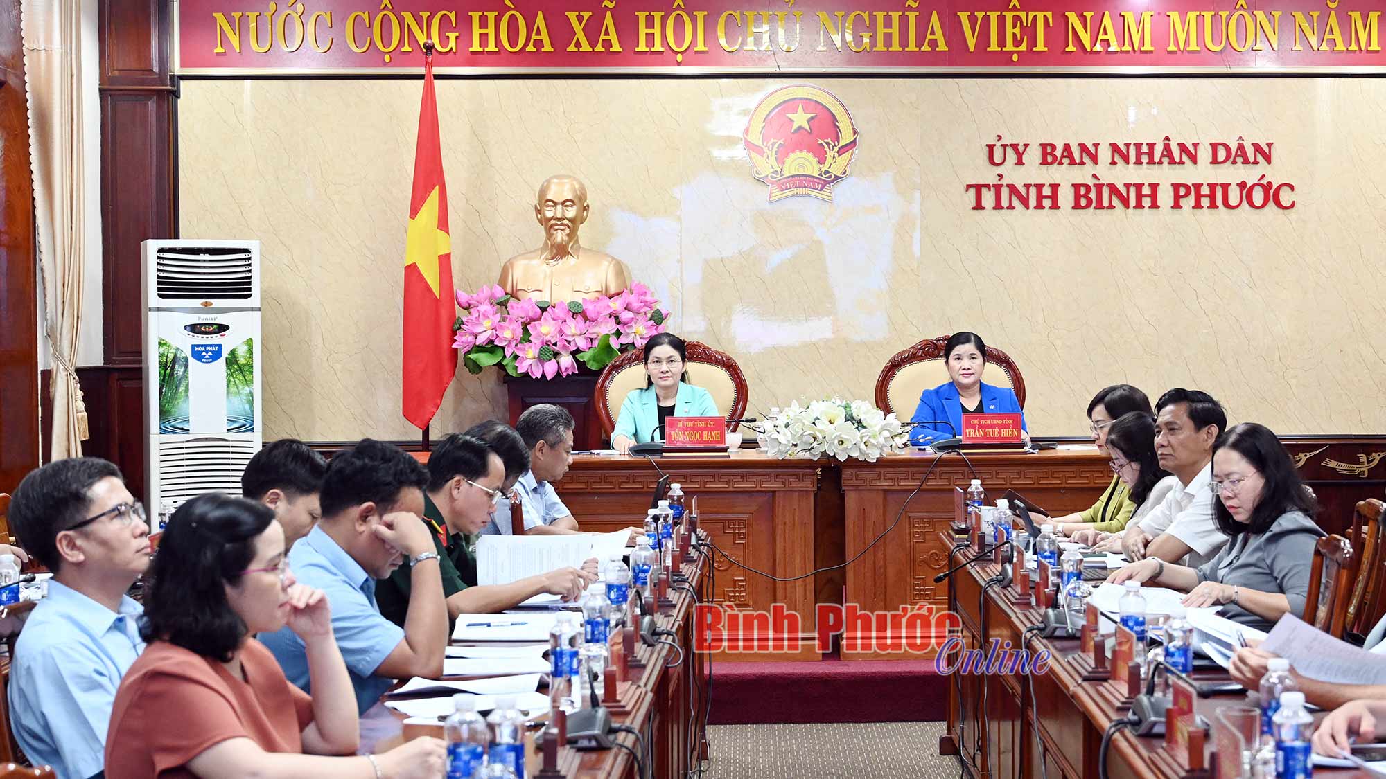 BPO - Chiều 10-3, tại điểm cầu Bình Phước, Ủy viên dự khuyết Trung ương Đảng, Bí thư Tỉnh ủy Tôn Ngọc Hạnh; Chủ tịch UBND tỉnh Trần Tuệ Hiền cùng lãnh...